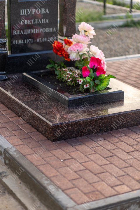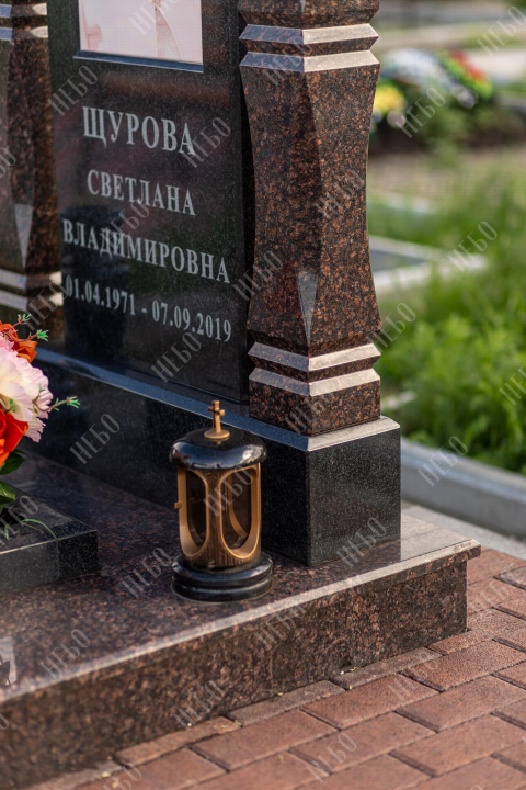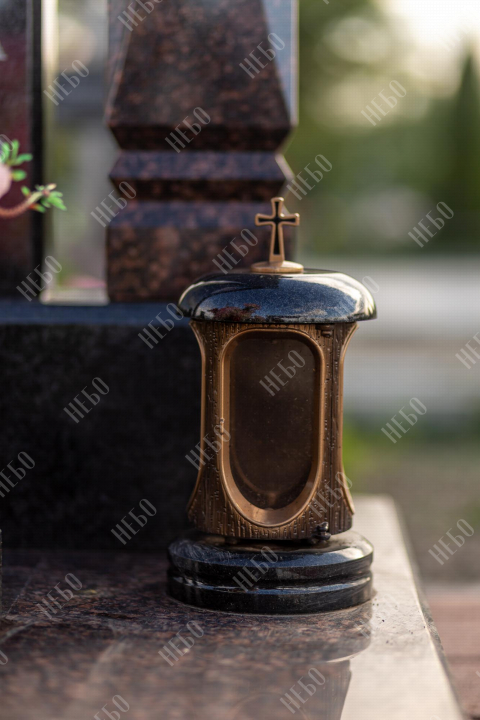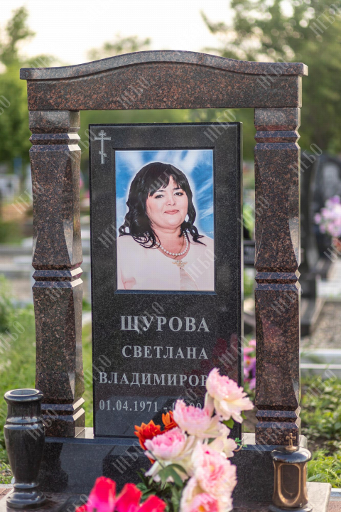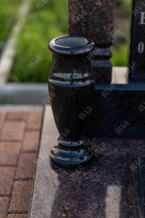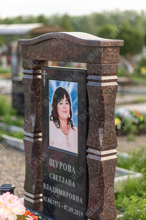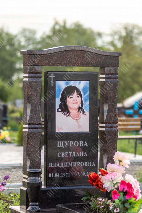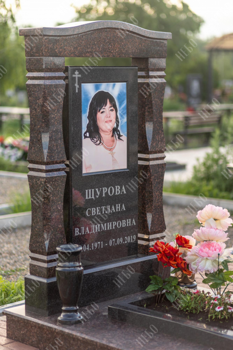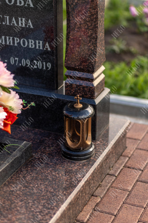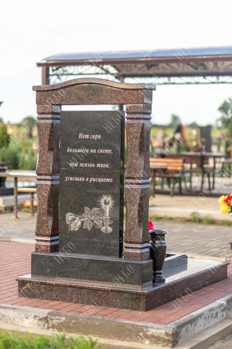 Памятник арка выполнен в классических темных оттенках, имеет открытое надгробие, лампаду и вазу у основания стелы, заказать в Луховицах.